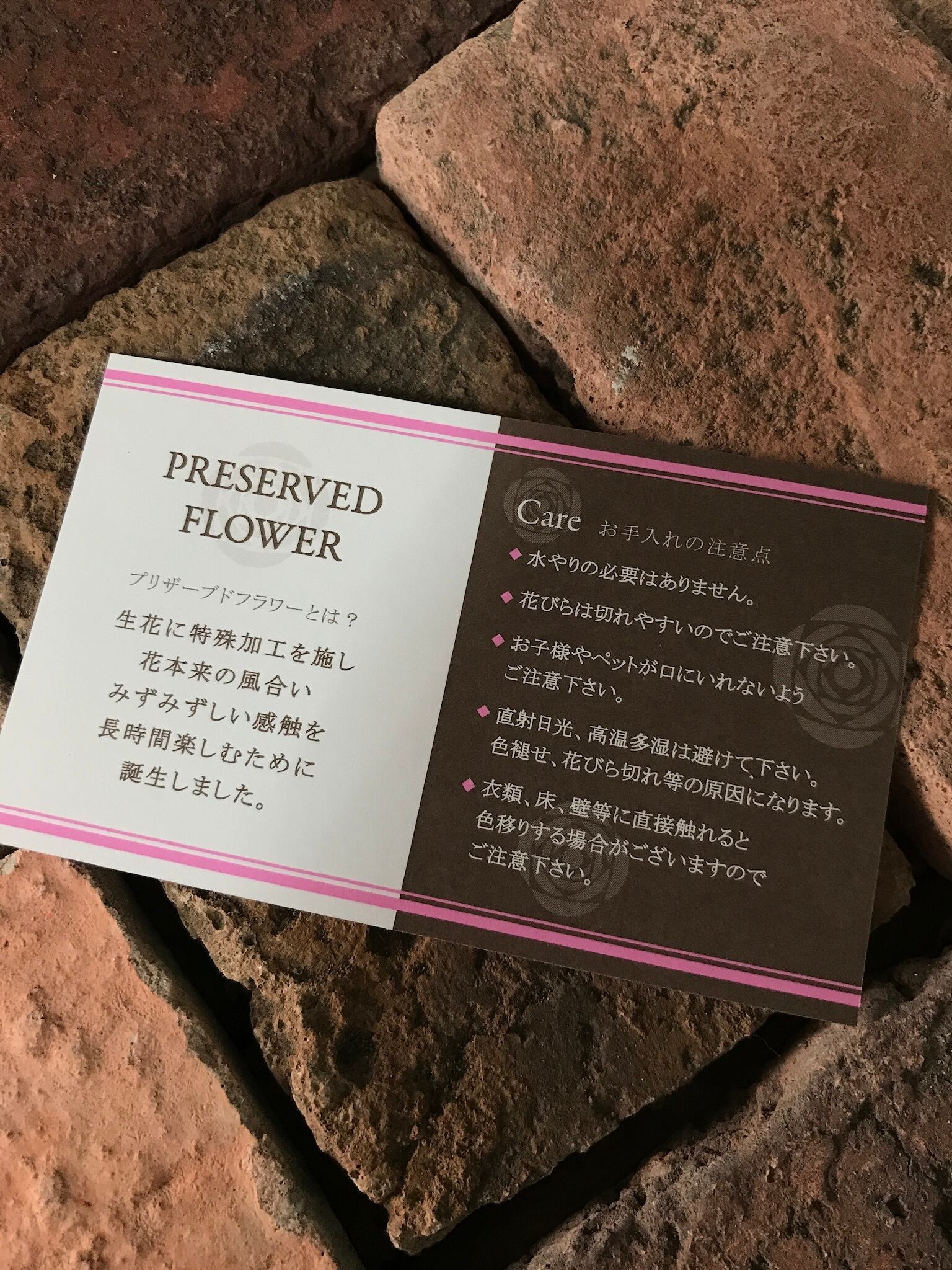 プリザーブドフラワーには、すべて写真3枚目の取扱説明書をお付けしております。プリザーブドフラワーアレンジメントです。